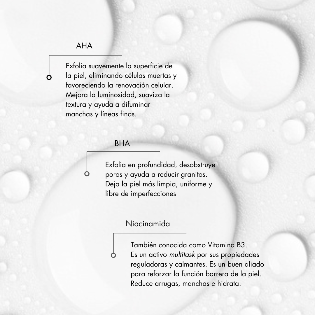 Formulada con ácido glicólico, niacinamida, ácido salicílico y azeloglicina, esta combinación de activos trabaja en sinergia para exfoliar suavemente, limpiar los poros desde dentro, regular el sebo, calmar la inflamación y mejorar visiblemente la textura de la piel.